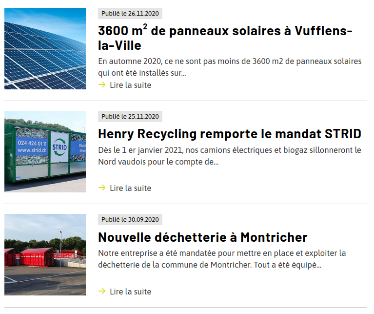 Ces blocs ont été développés pour répondre au besoin de la page news du site henry-recycling.ch. Avec ces blocs, notre client peut créer des pages dans lesquelles il décrit des actualités. Ces pages ne sont pas accessibles directement par la navigation du site. Mais sur sa page news, le bloc newslist affiche automatiquement la liste de toutes les actualités, classée dans l'ordre décroissant des dates de publications (la plus récente en premier), et permet aux visiteurs de voir un aperçu de l'actualité, et de cliquer pour en savoir plus.